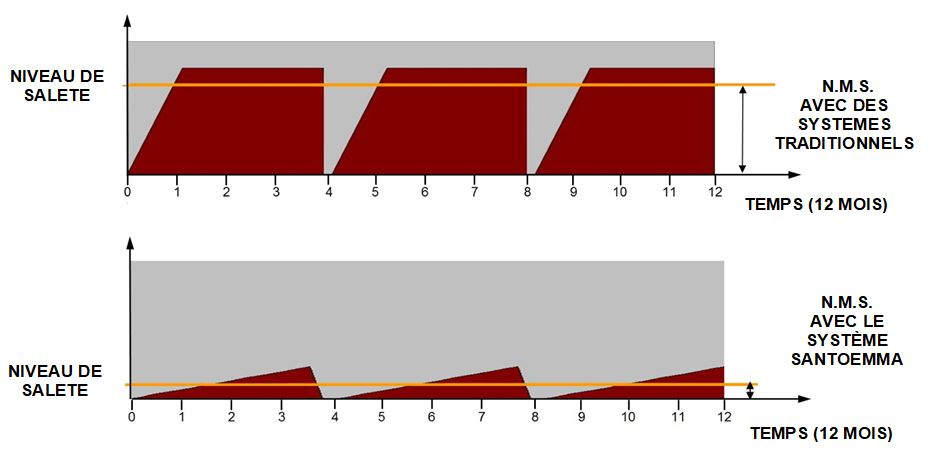 Le niveau moyen de saleté (N.M.S.) entre un lavageet le suivant devient donc beaucoup plus bas.