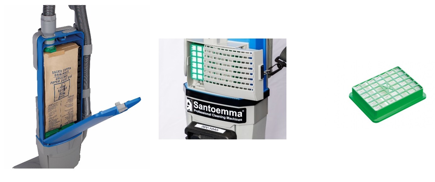 La macchina è dotata di un ampio sacchetto in carta per raccogliere la polvere e di un sistema di filtrazione a più livelli, che garantiscono la massima sicurezza igienica per l'operatore, isolando perfettamente la polvere raccolta, fino al suo smaltimento.