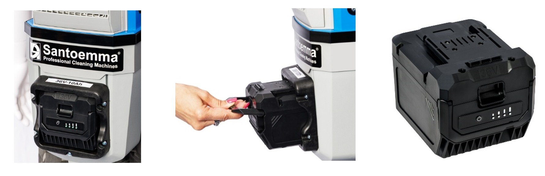 La potente batteria agli ioni di Litio da 36V, con 10Ahdi capacità, consente una lunga autonomia di lavoro, nonostante la potenza di aspirazione della macchina.